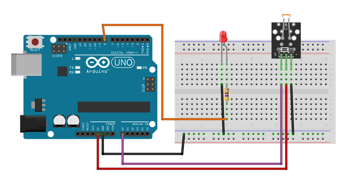 Look at the picture to see how to connect the LED & LDR to your Arduino Uno: