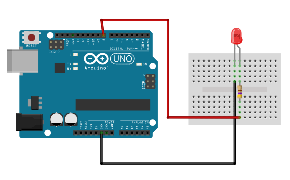 void setup() { pinMode(8, OUTPUT); } void loop() { digitalWrite(8, HIGH); // turn LED on delay(1000); // wait 1 second digitalWrite(8, LOW); // turn LED off delay(1000); // wait 1 second }